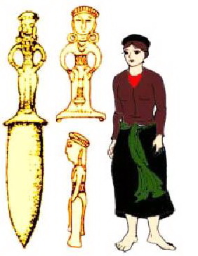 Thời Hùng Vương, họ cũng đã tạo ra được bộ váy đẹp cho người phụ nữ (tượng phụ nữ trên cán dao găm) hoặc đàn ông thì đóng khố.